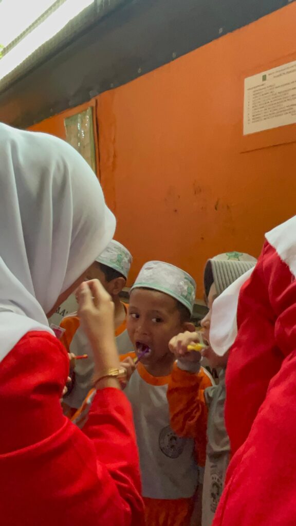 Kegiatan ini bertujuan untuk meningkatkan kesadaran pentingnya menjaga kesehatan gigi dan mulut sejak dini. Para mahasiswa menjelaskan dengan cara yang menyenangkan — menggunakan video, lagu, dan contoh alat peraga. Santri-santriwati pun antusias mengikuti setiap arahan, terutama saat sesi praktik menyikat gigi bersama.