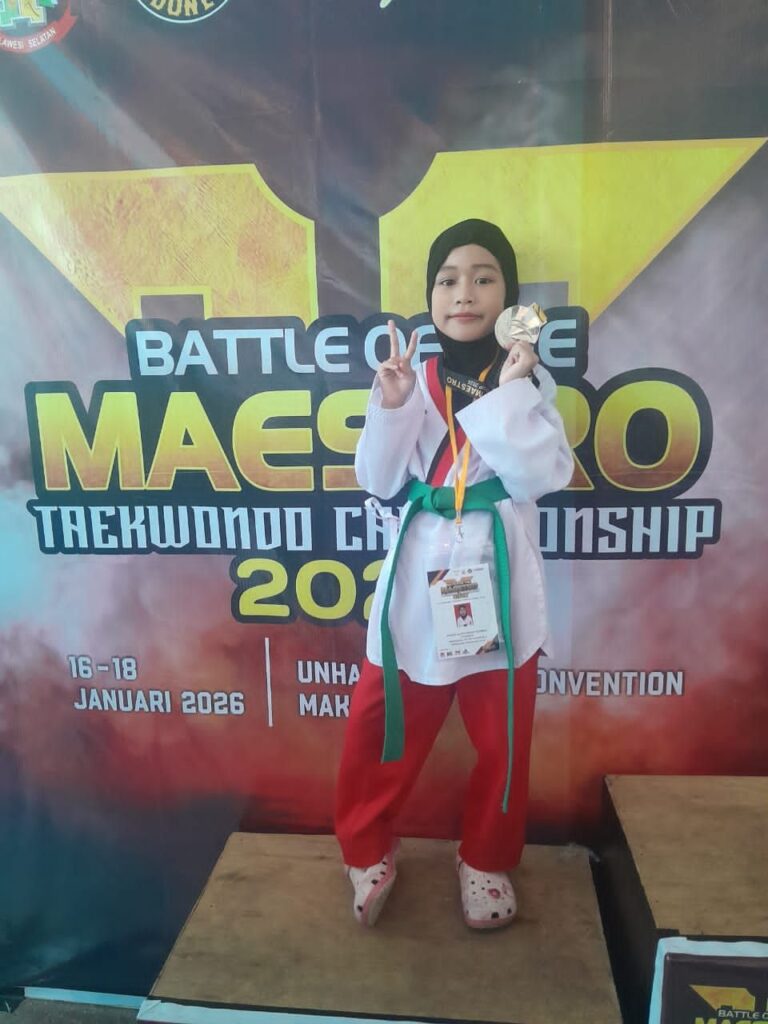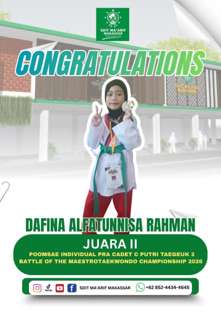-SDIT Ma’arif Makassar, Ananda Dafina Alfatunnisa Rahman berhasil meraih prestasi membanggakan dengan mendapatkan juara 2 dalam kompetisi taekwondo tingkat provinsi. Prestasi ini diraihnya pada Kejuaraan Battle Of The Maestro Taekwondo Championship 2026 – Grade C yang berlangsung tanggal 16-18 Januari 2026 di Hotel & Konvensi UNHAS, Makassar.