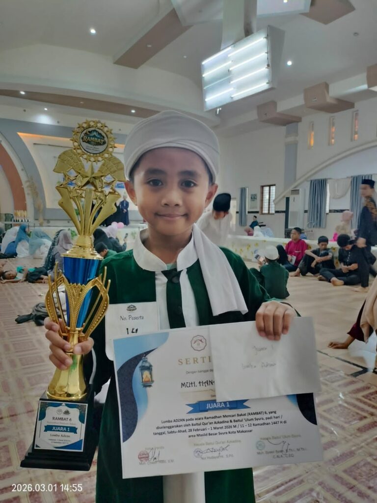 – SDIT Ma’arif Makassar meraih prestasi membanggakan ketika salah satu Santri, Muh. Hanan Attaki, berhasil menjadi juara 1 dalam Lomba Adzan pada acara Ramadhan Mencari Bakat (RAMBAT) 6. Acara yang diselenggarakan oleh Baitul Qur’an Azkadina dan Baitul ‘Ulum Syura berlangsung pada hari Sabtu hingga Ahad, 28 Februari – 1 Maret 2026 M (11 – 12 Ramadhan 1447 H) di Masjid Besar Syura Kota Makassar.