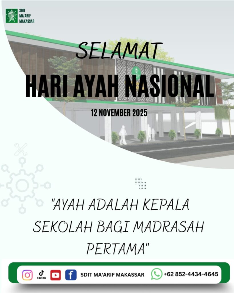 -SDIT Ma’arif Makassar, Hari ayah nasional diperingati setiap tanggal 12 November, peringatan ini tidak kalah pentingnya dengan Hari Ibu. Hari ini memperingati Hari Ayah dengan melakukan kegiatan membuat video moment bersama ayah dan memberikan surprise untuk ayah dengan mengabadikan moment tersebut melalui video kelas serta catatan special Hari Ayah. Ungkapan terima kasih kepada ayah ini disampaikan atas peranannya sebagai tulang punggung, panutan dan pelindung dalam rumah tangga.