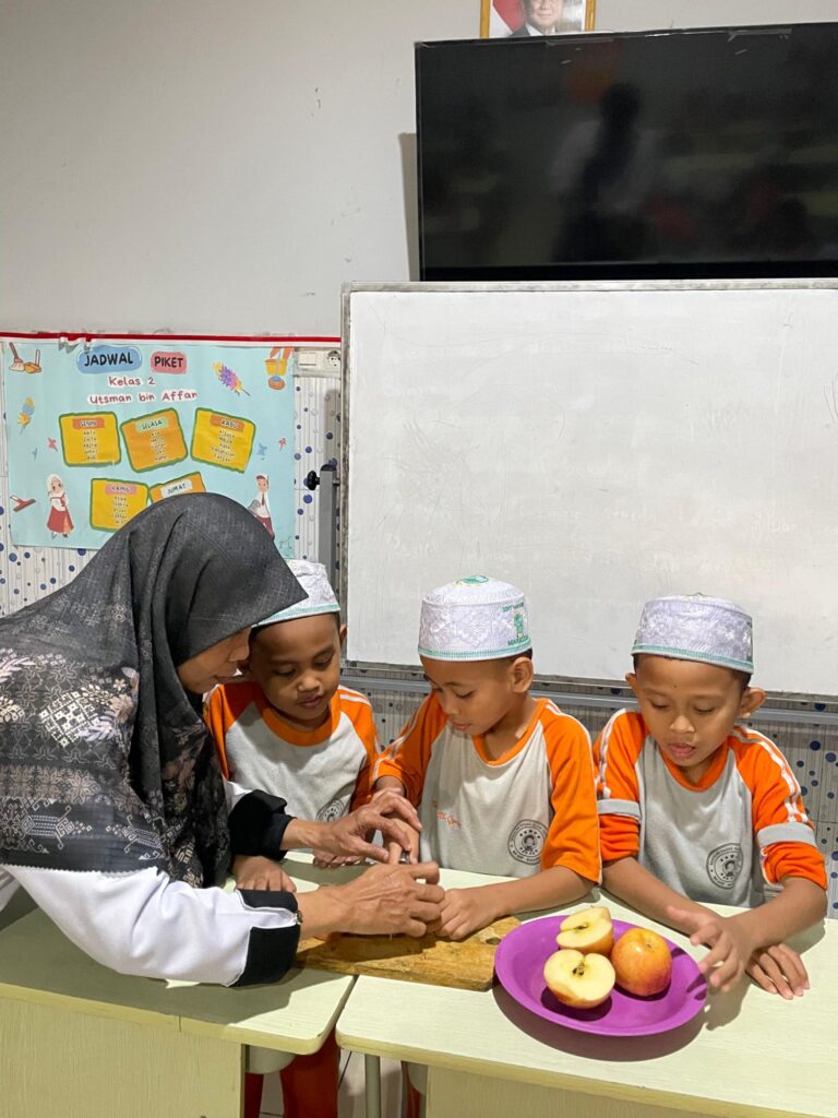 Dalam kegiatan yang diadakan di ruang kelas 2 Umar, para santri diajak untuk langsung berinteraksi dengan apel segar. Wali Kelas, Sumiati, S.Pd.Gr., yang juga menjadi guru matematika pada kelas tersebut, menjelaskan bahwa proses pembelajaran ini melibatkan santri dalam mengelompokkan apel secara merata, menghitung jumlah per kelompok, dan mengidentifikasi pola pembagian yang muncul. “Dengan menggunakan objek nyata seperti apel, santri lebih mudah memahami konsep pembagian. Proses pengamatan dan pengulangan yang mereka lakukan juga merupakan dasar dari konsep deep learning yang akan bermanfaat bagi perkembangan pemikiran mereka ke depannya,” ujarnya.